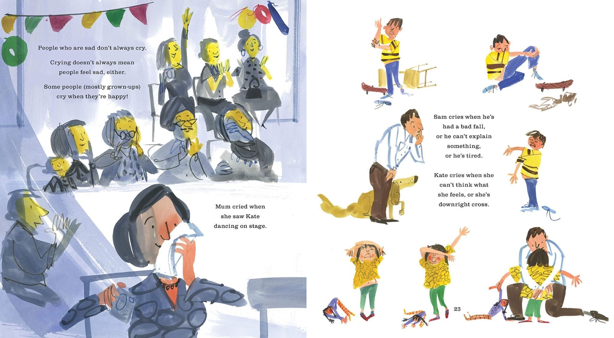 Cuốn sách cho độc giả nhí thấy cảm xúc của trẻ em ở trong nhiều tình huống khác nhau, lúc ở nhà lẫn ở trường, đồng thời chỉ ra cách chúng thay đổi cảm xúc theo thời gian, cảm xúc có thể leo thang như thế nào và cách mọi người giúp đỡ lẫn nhau. Văn bản cực tinh tế và nhạy cảm của Amanda McCardie, cùng minh hoạ tuyệt vời của Salvatore Rubbino, đã mang đến vẻ sống động như thật trong quá trình thay đổi cảm xúc của trẻ nhỏ và mô tả các sắc thái hành vi của trẻ em.