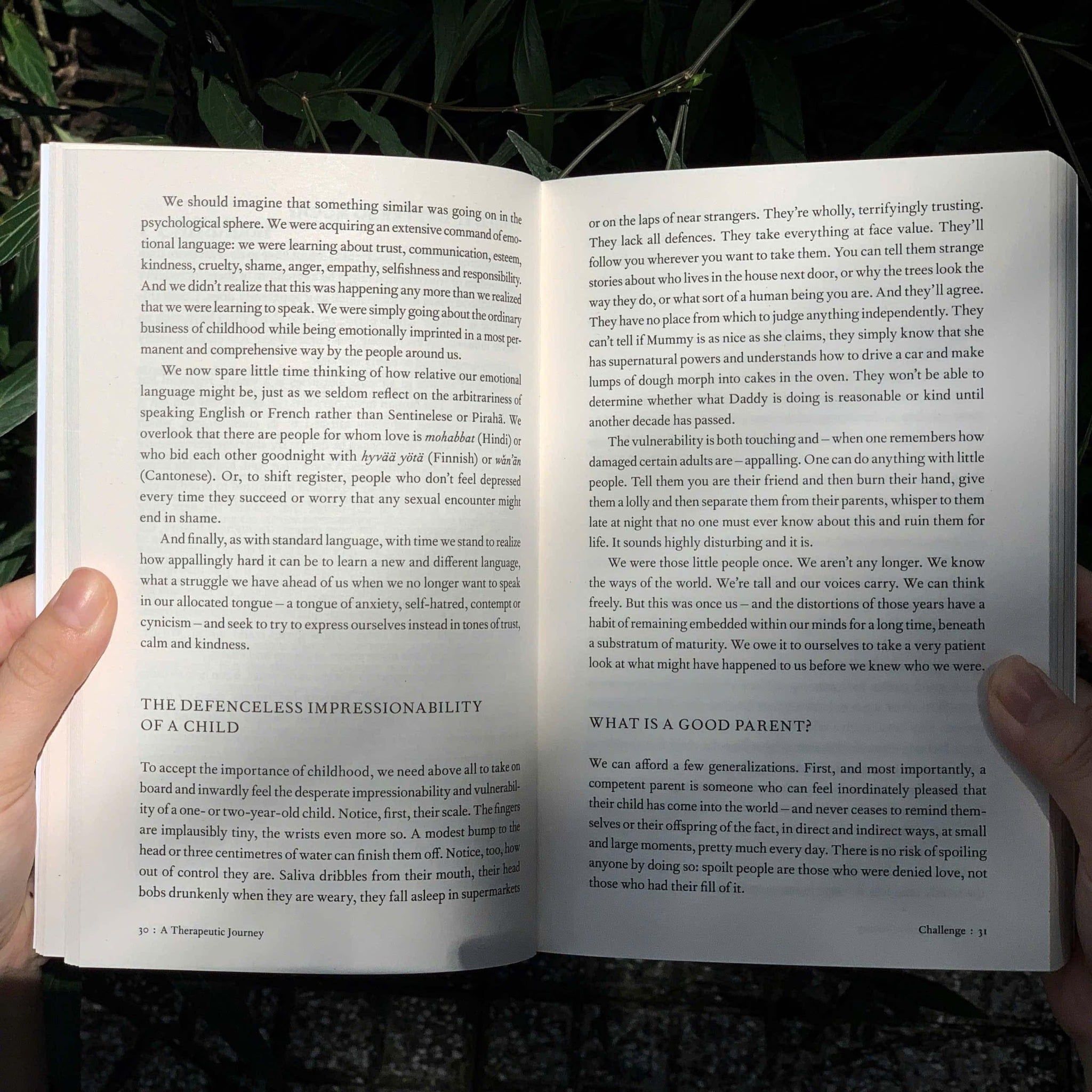 Ngôn từ mượt mà và giàu tính chữa lành của de Botton tạo nên một bầu không khí tĩnh tại, gợi cảm giác như đang nghỉ dưỡng nơi vùng núi hoặc bên bờ biển. Xen kẽ trong đó là những lời khuyên đơn giản, dễ thực hiện, từ những thói quen nhỏ như ngâm mình trong bồn tắm, thưởng thức trái cây, đến cách xây dựng mối quan hệ giàu cởi mở và sự hiện diện.