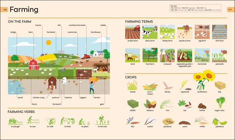 Mỗi chủ đề được trình bày với minh họa toàn cảnh, giúp trẻ thấy từ vựng trong ngữ cảnh cụ thể và dễ nhớ. Mỗi từ đều được trình bày rõ ràng với chú thích phần từ loại (danh từ, động từ, tính từ…) để trẻ làm quen với cấu trúc ngữ pháp một cách tự nhiên. Các bong bóng thoại chứa những câu tiếng Anh thực tế giúp trẻ học cách sử dụng từ ngữ trong tình huống thường ngày.