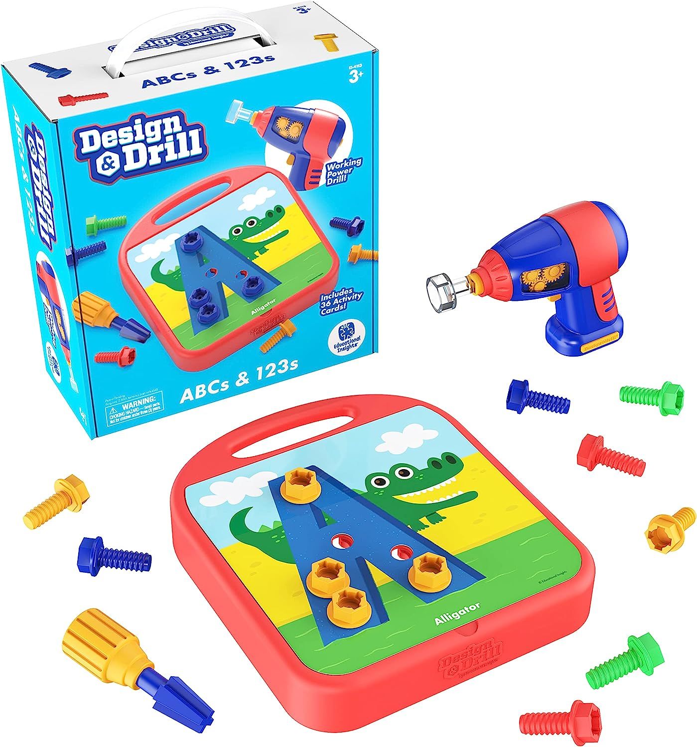 Thuộc series đồ chơi giáo dục nổi tiếng Design and Drill nổi tiếng của NXB Educational Insights, Design & Drill® ABCs & 123s đem đến hoạt động học số và bảng chữ cái vui nhộn thông qua hoạt động vui nhộn với chiếc máy khoan và những bu lông đầy sắc màu.