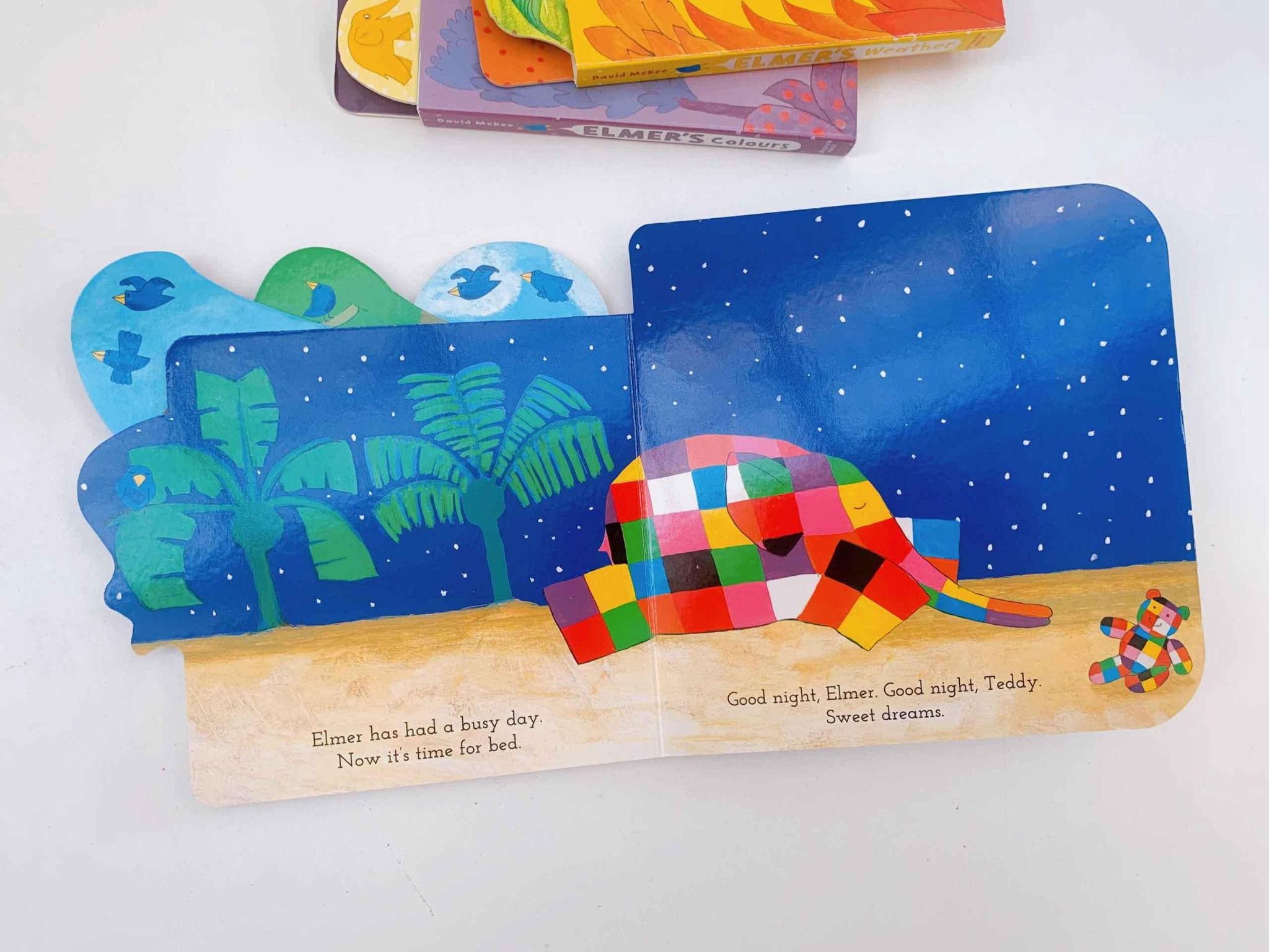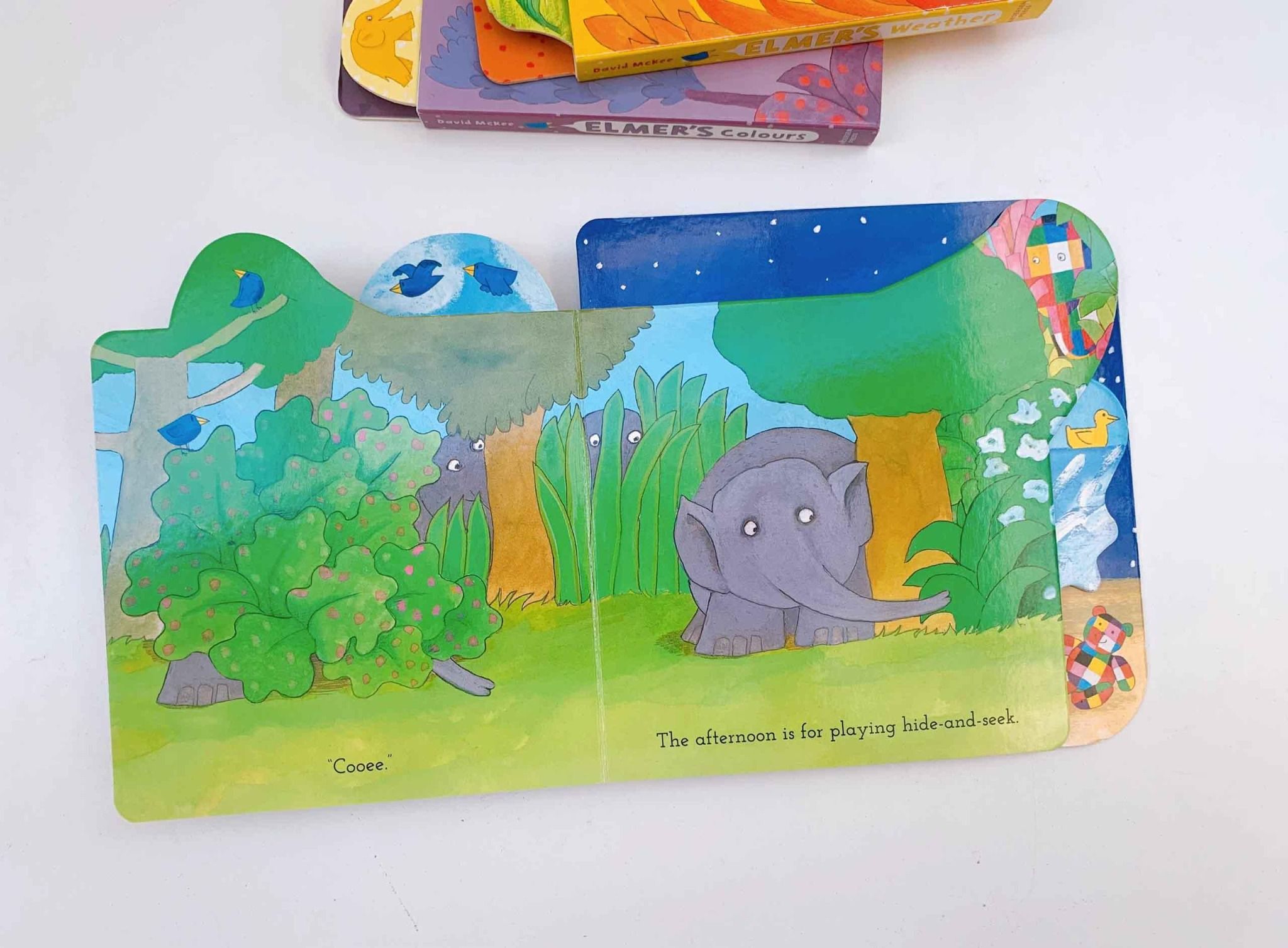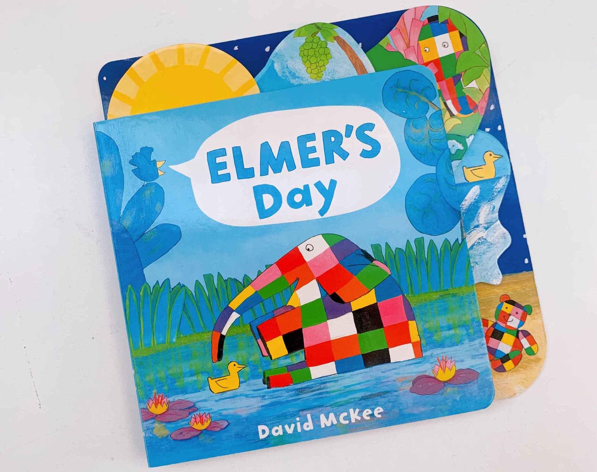 Elmer's Day thuộc series sách “Tabbed Board Book” của NXB Walker, gồm những cuốn sách bảng kích thước cầm vừa tay trẻ nhỏ, với các tab dễ cầm nắm trên các trang sách. Mỗi tab được định hình riêng lẻ, mang lại định dạng thúc đẩy xúc giác và biểu cảm.