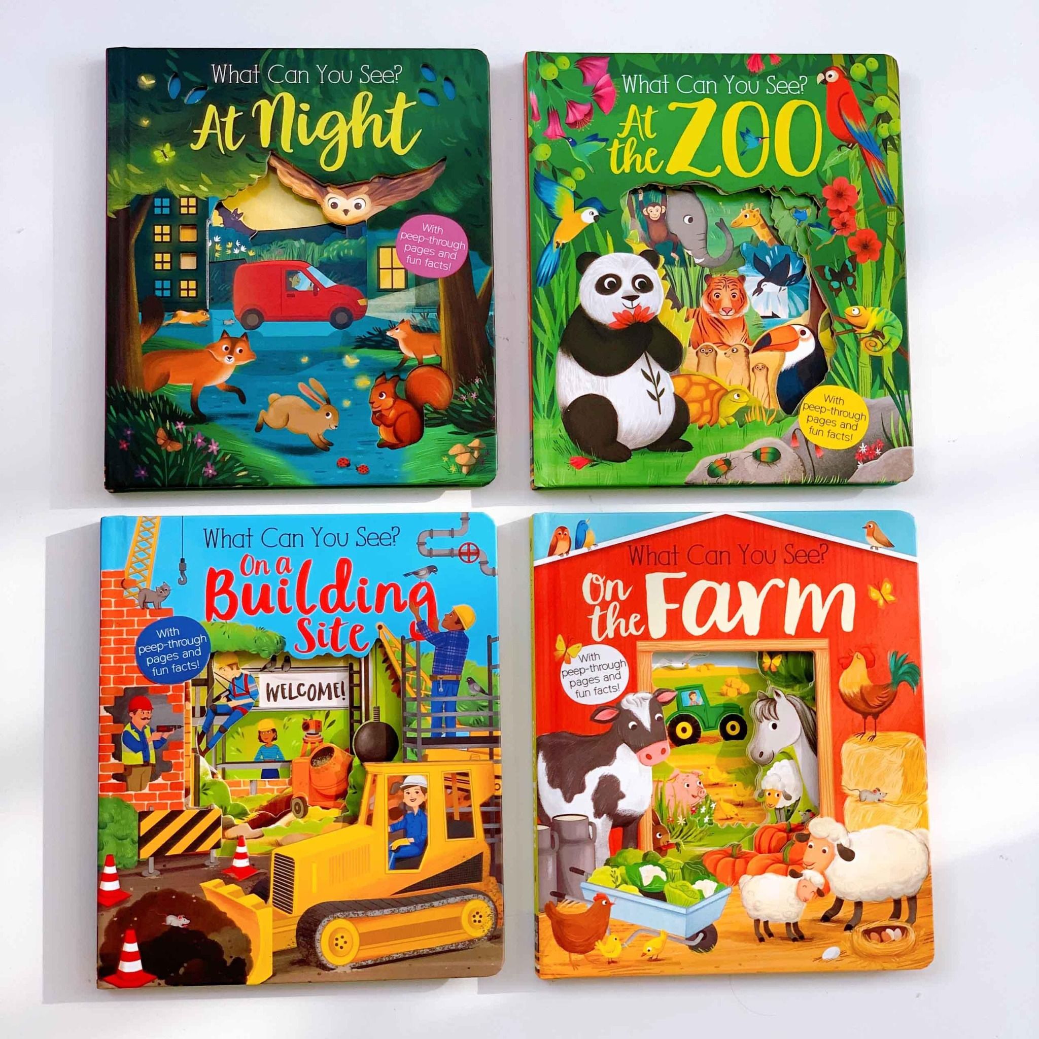 Peep Inside Board Books What Can You See? gồm 4 cuốn sách board book thuộc series “What Can You See?” của NXB Little Tiger. Loạt sách với minh hoạ đầy màu sắc này đem đến các sự thật vui nhộn và các trang cắt nhìn xuyên qua mang tính tương tác cao, để bé tìm hiểu các khung cảnh khác nhau.