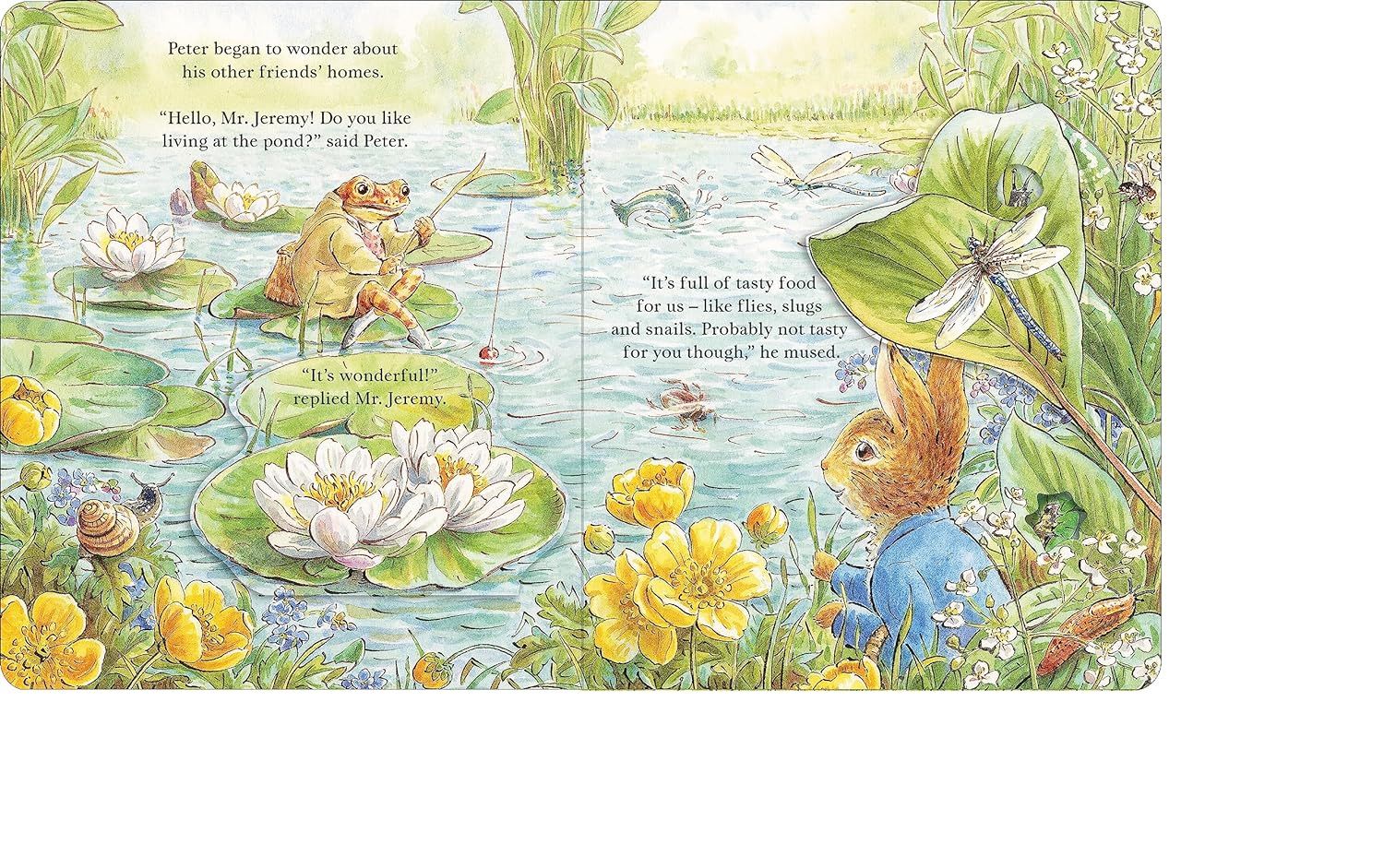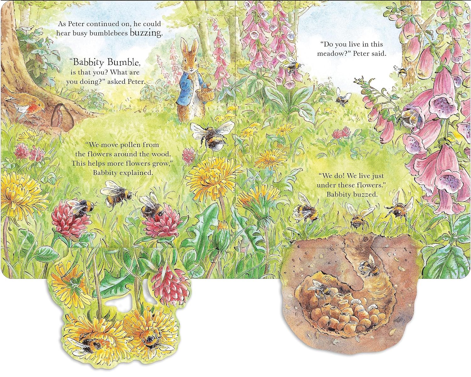 Trên đường ghé thăm người bạn Squirrel Nutkin, Thỏ Peter đã bắt gặp rất nhiều những nhân vật quen thuộc khác nhau. Khi lật giở những tấm cắt, bé sẽ khám phá ngôi nhà ấm áp và an toàn của Mrs.Tittlemouse, ngắm nhìn những chú ong đang hút mật và làm nhiệm vụ thụ phấn hay gặp gỡ chú ếch Jeremy và nghe kể về sở thích sống dưới nước của loài ếch. Hãy tham gia cùng Peter Rabbit trong câu chuyện phiêu lưu thú vị này, với định dạng sách board book tuyệt đẹp, gồm các lỗ cắt để nhìn và các tấm lật mở kích thích tương tác.