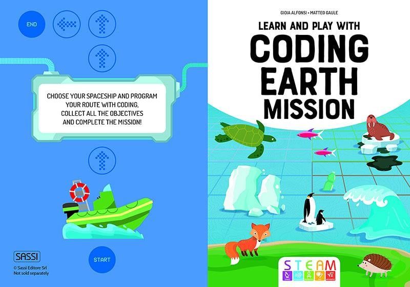 Play and Learn with Coding: Mission Earth giúp trẻ em học cách trò chuyện với công nghệ trong khi vẫn tận hưởng được niềm vui đến từ trò chơi và cuốn sách lập trình hấp dẫn. Sản phẩm kết hợp cuốn sách 32 trang và một trò chơi hỗ trợ trẻ học STEAM và làm quen với khái niệm lập trình. Tất cả chi tiết được đựng trong hộp bìa cứng chắc chắn, có dây cầm, tiện lợi cho dọn dẹp và có thể mang theo bất cứ đâu.