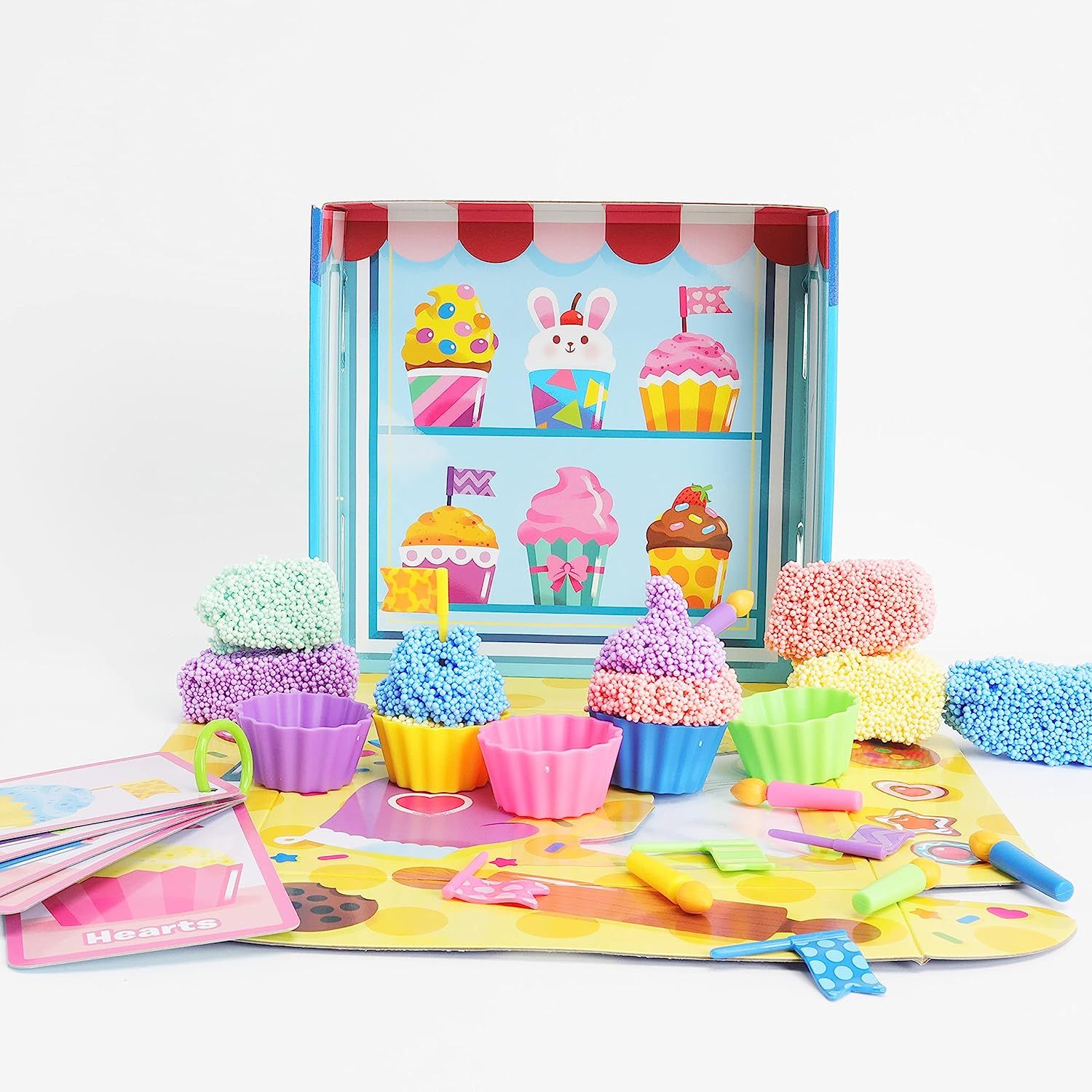 Bao gồm 5 cục bọt biển với 5 màu khác nhau, 5 giấy gói bánh nướng, 5 cây nến nhựa, 5 thẻ đặt hàng hai mặt thẻ hình ảnh hai mặt, thảm chơi có thể gấp đôi và 1 hướng dẫn hoạt động.