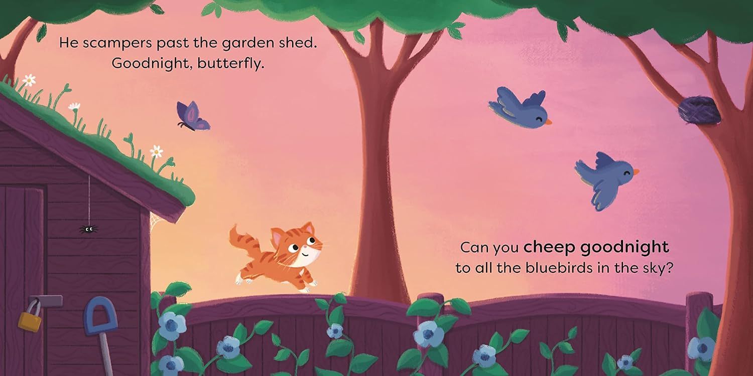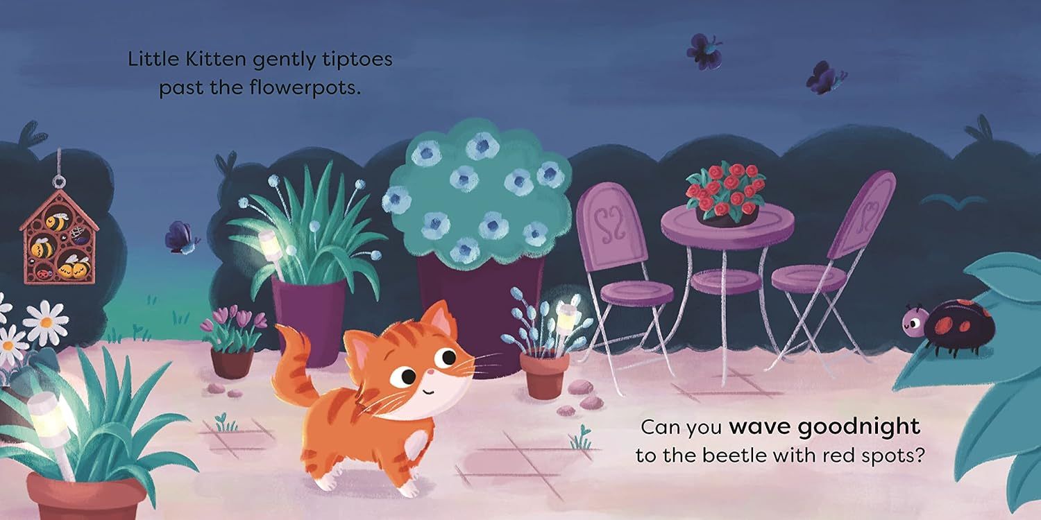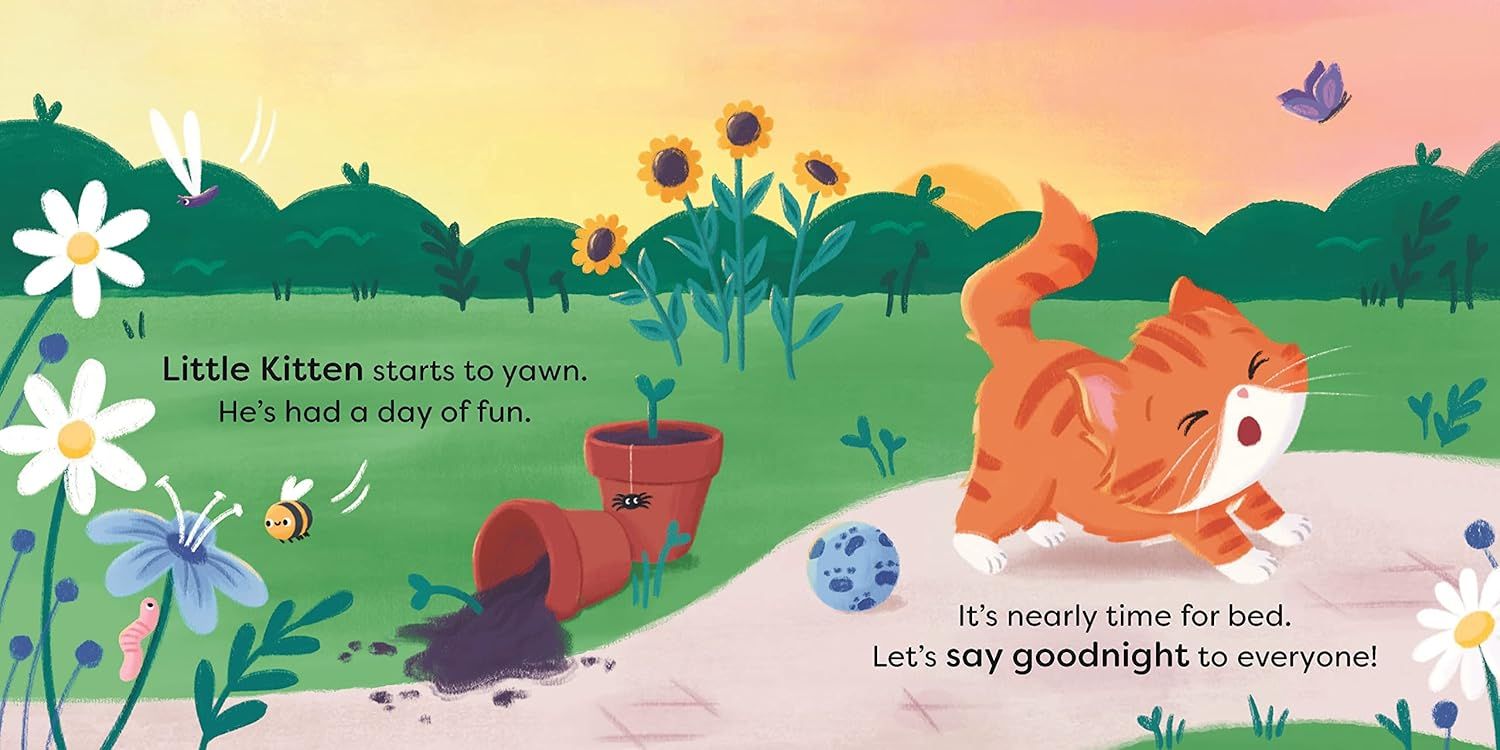 Trên hành trình từ vườn về nhà, bé mèo chào tạm biệt từng người bạn nhỏ – từ những chú ong ong, chim chóc, đến những bông hoa đang khép mình. Đồng thời mời bé đọc cùng nói lời chúc ngủ ngon, hát ru, hoặc thậm chí gửi một nụ hôn chúc ngủ ngon đến từng sinh vật.
