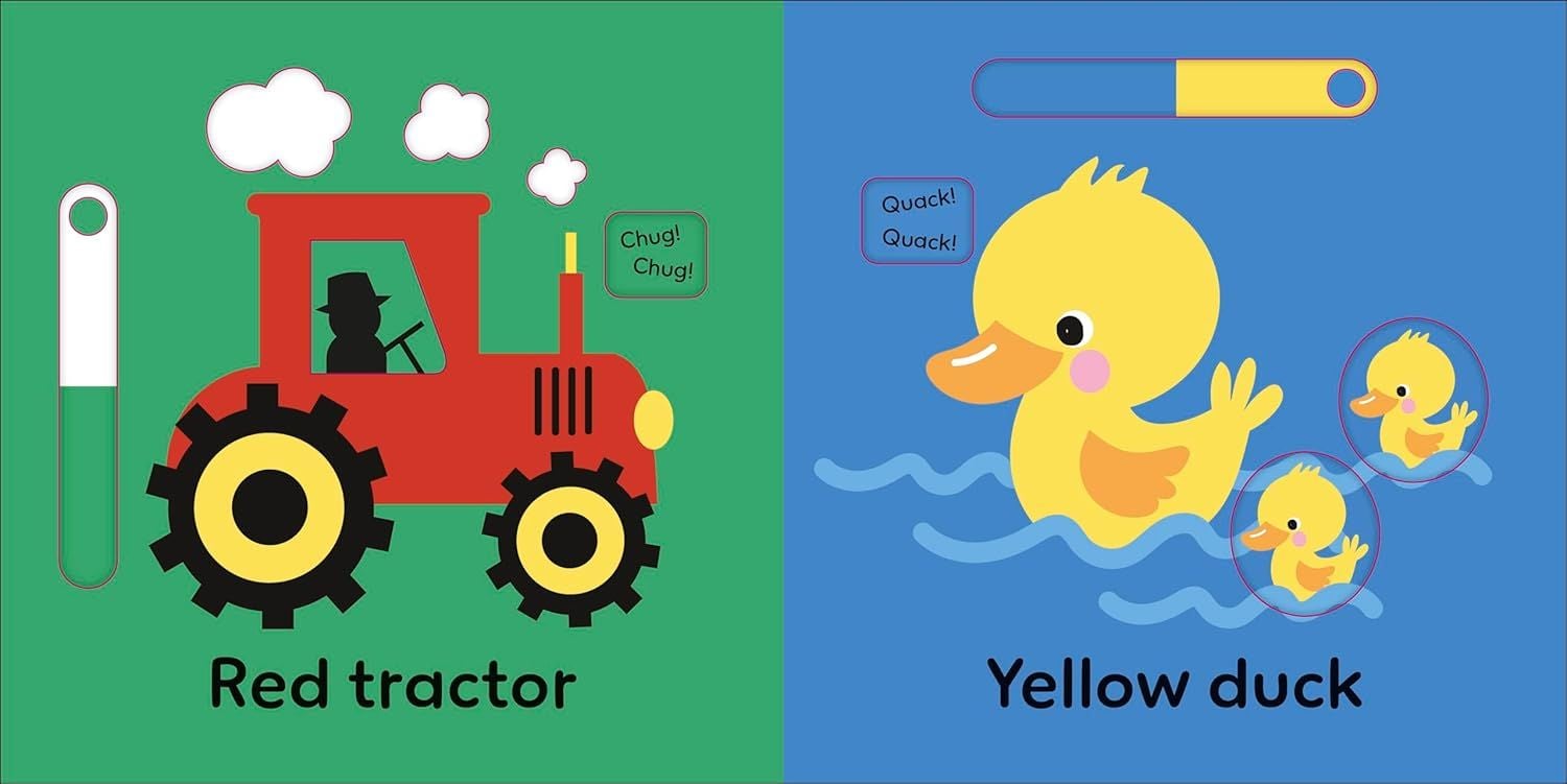 Những hình minh họa rực rỡ như cầu vồng lấp lánh sắc màu hay chiếc máy kéo đỏ đang chạy ì ạch sẽ thu hút sự chú ý của trẻ, trong khi phần chữ đơn giản, rõ ràng giúp bé dễ dàng nhận biết và ghi nhớ. Bé sẽ thích thú trượt tay để khám phá những bí mật ẩn sau từng khung hình – một trải nghiệm học tập kết hợp chơi đùa đầy hứng khởi.