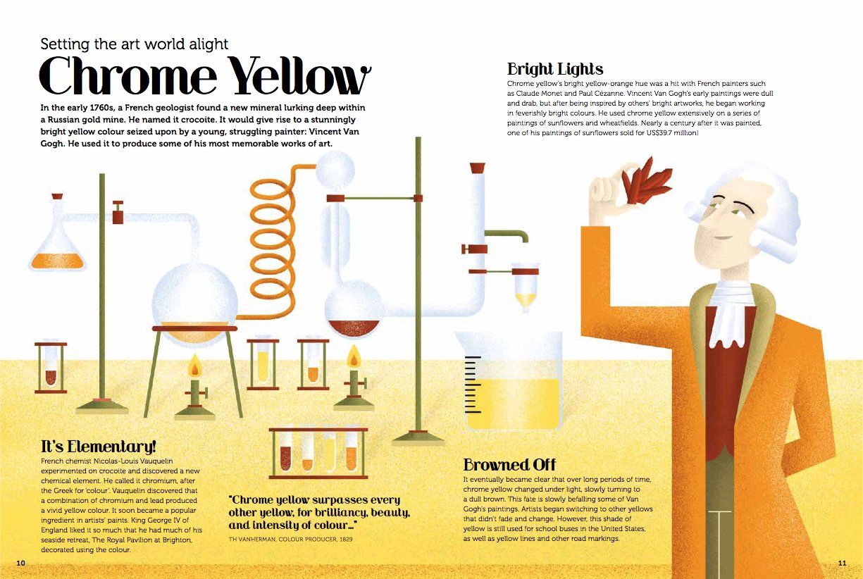 Từ đen đến trắng và tất cả các màu ở giữa, mỗi sắc thái đều có một câu chuyện để kể. Mỗi nhóm màu được giới thiệu bằng hình minh họa trải rộng trên hai trang tuyệt đẹp và mang tính diễn giải, tiếp theo là các mục minh họa khám phá lịch sử 'đầy màu sắc' của các sắc thái cụ thể.