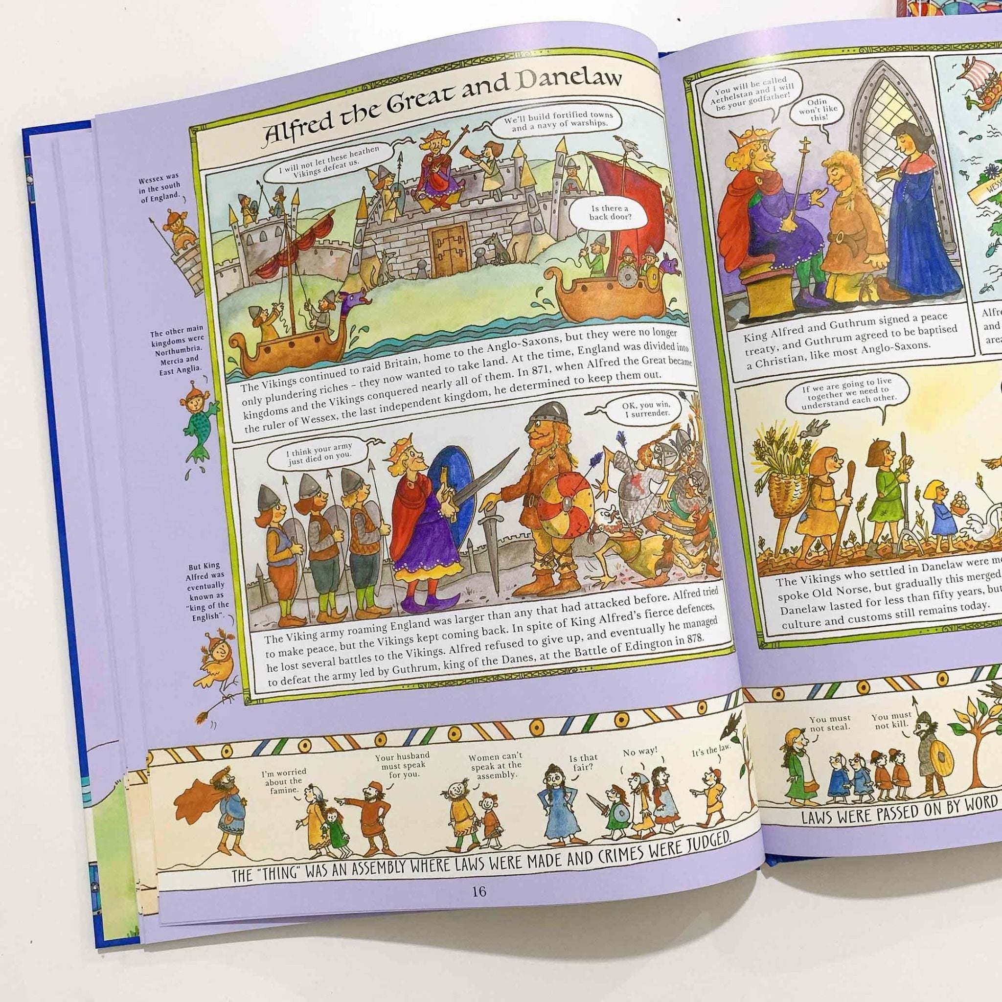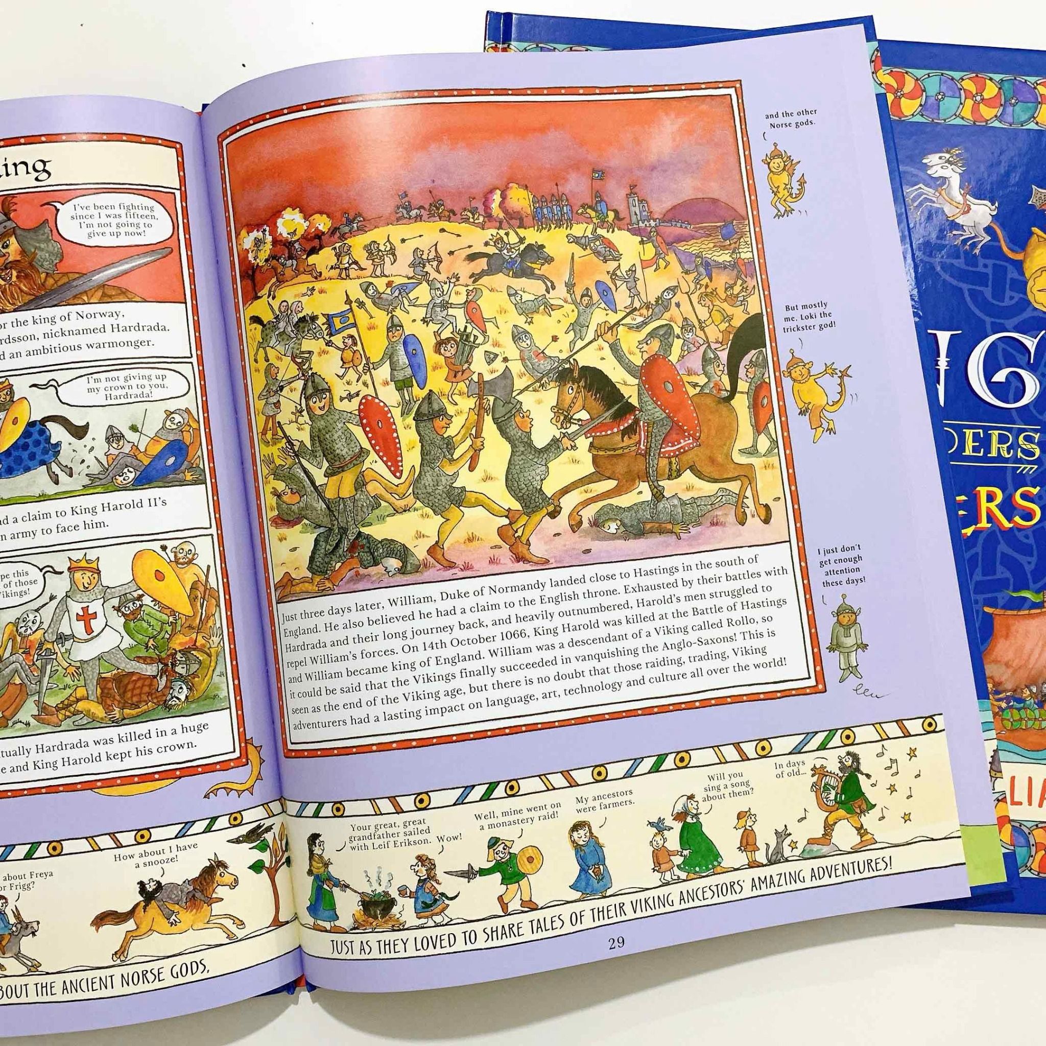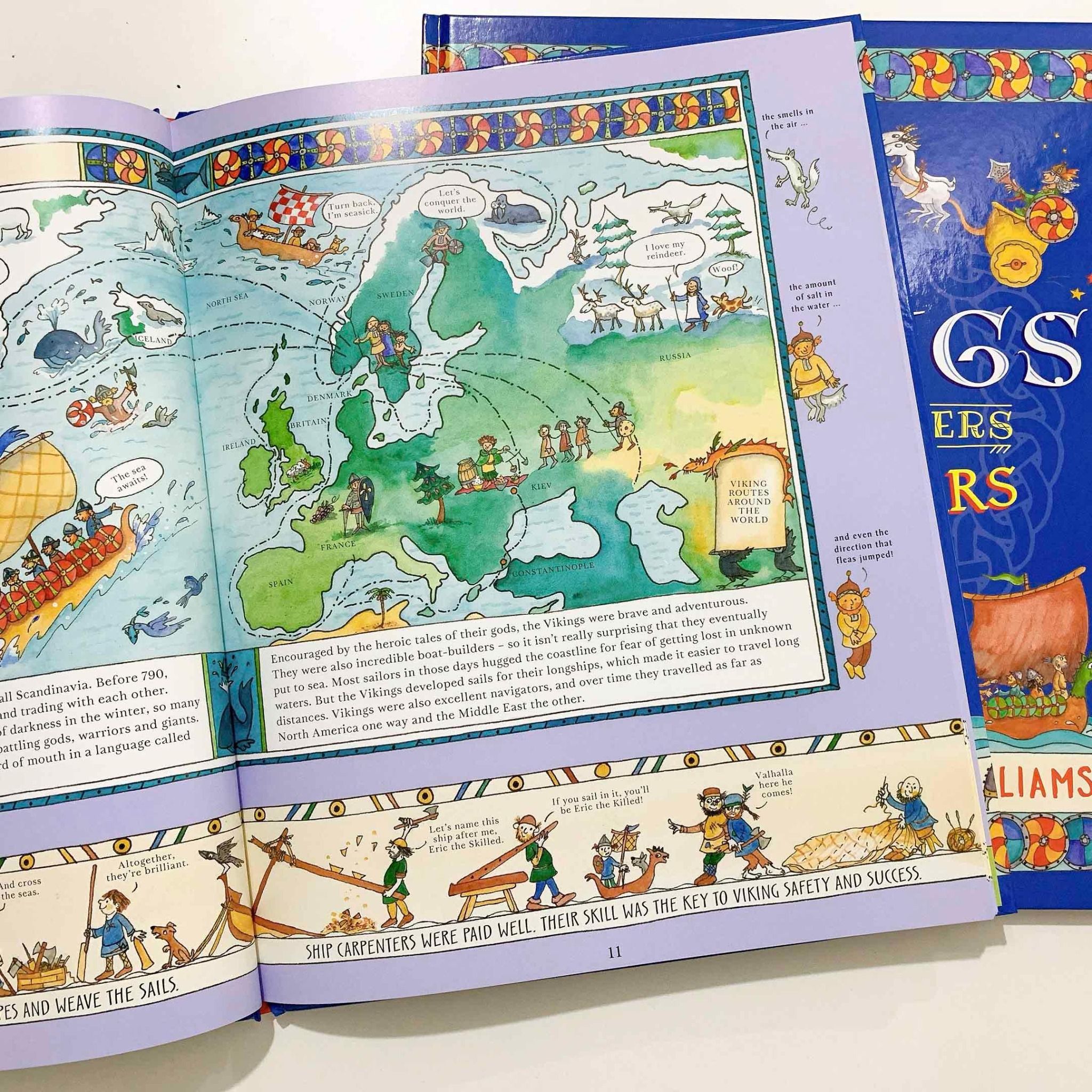 The Vikings: Raiders, Traders and Adventurers đưa trẻ du hành ngược thời gian quay lại thế giới tuyệt vời của người Viking. Cuốn sách có nội dung thú vị và minh hoạ đầy màu sắc, đến từ hoạ sĩ từng đạt giải thưởng và là tác giả của nhiều đầu sách thiếu nhi bán chạy – Marcia Williams.
