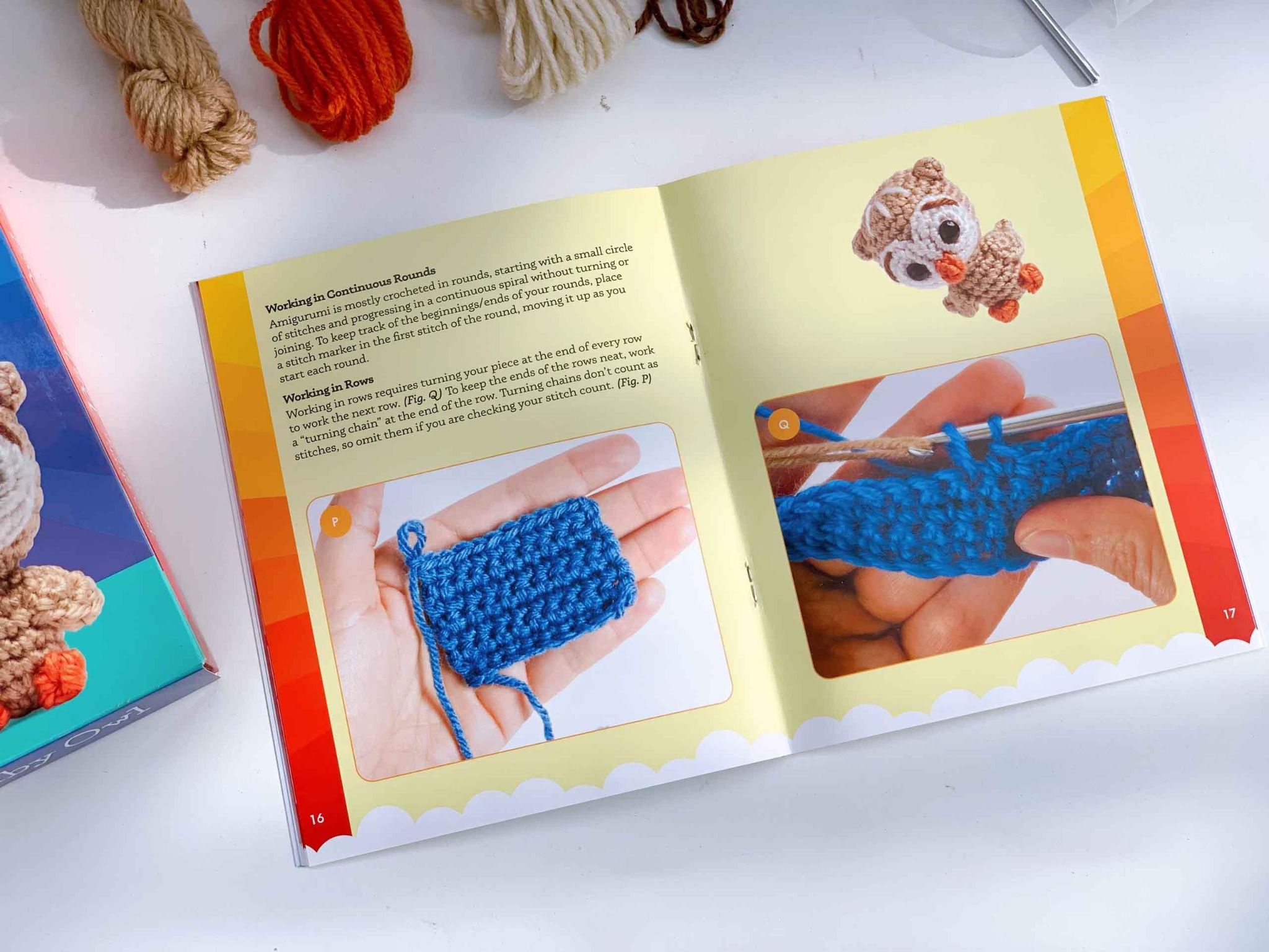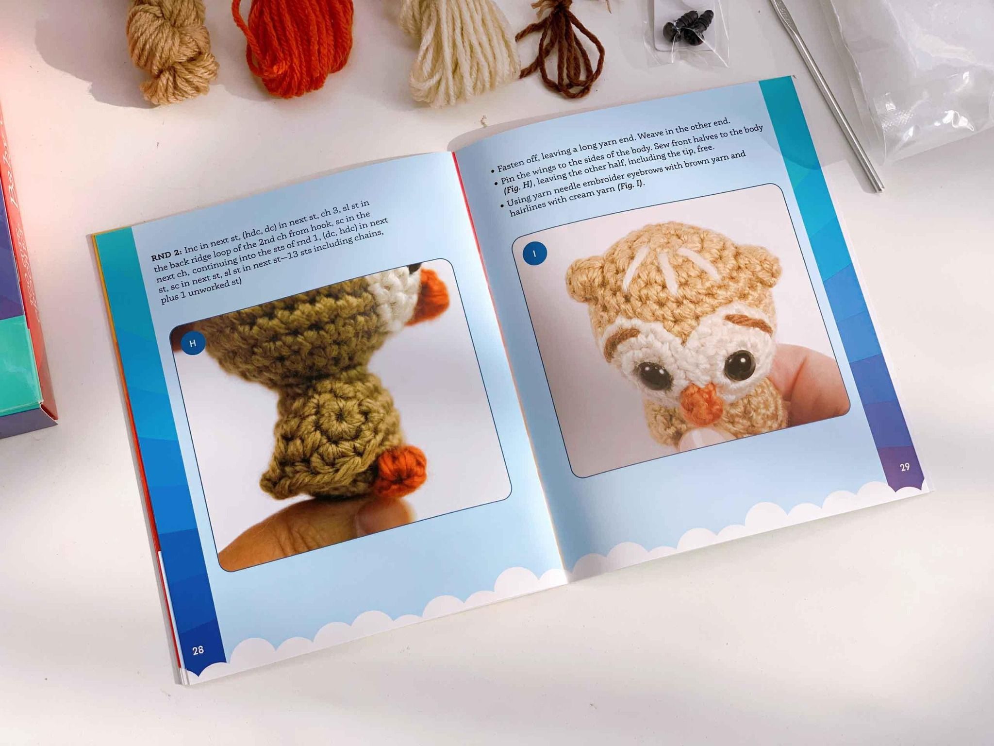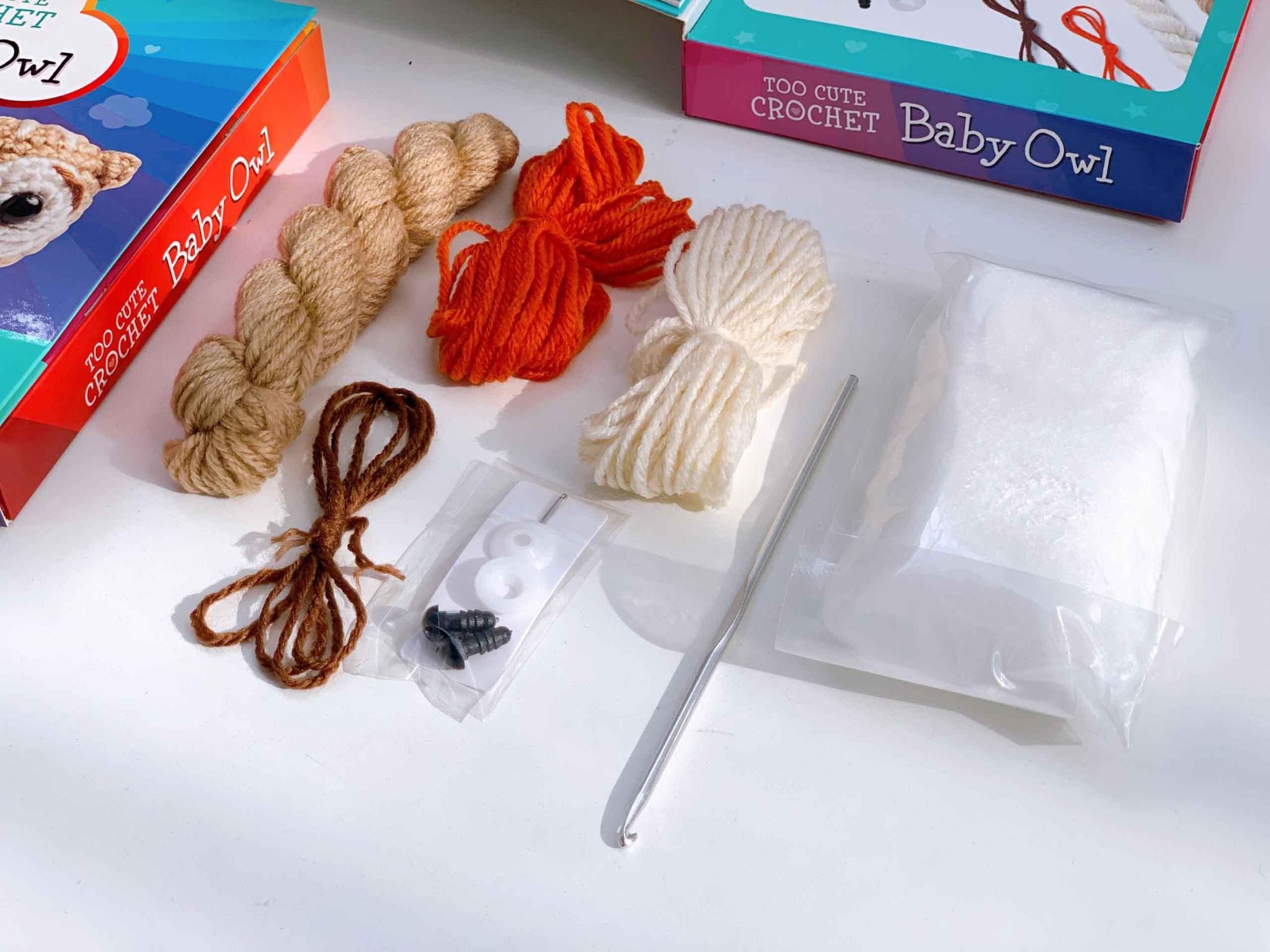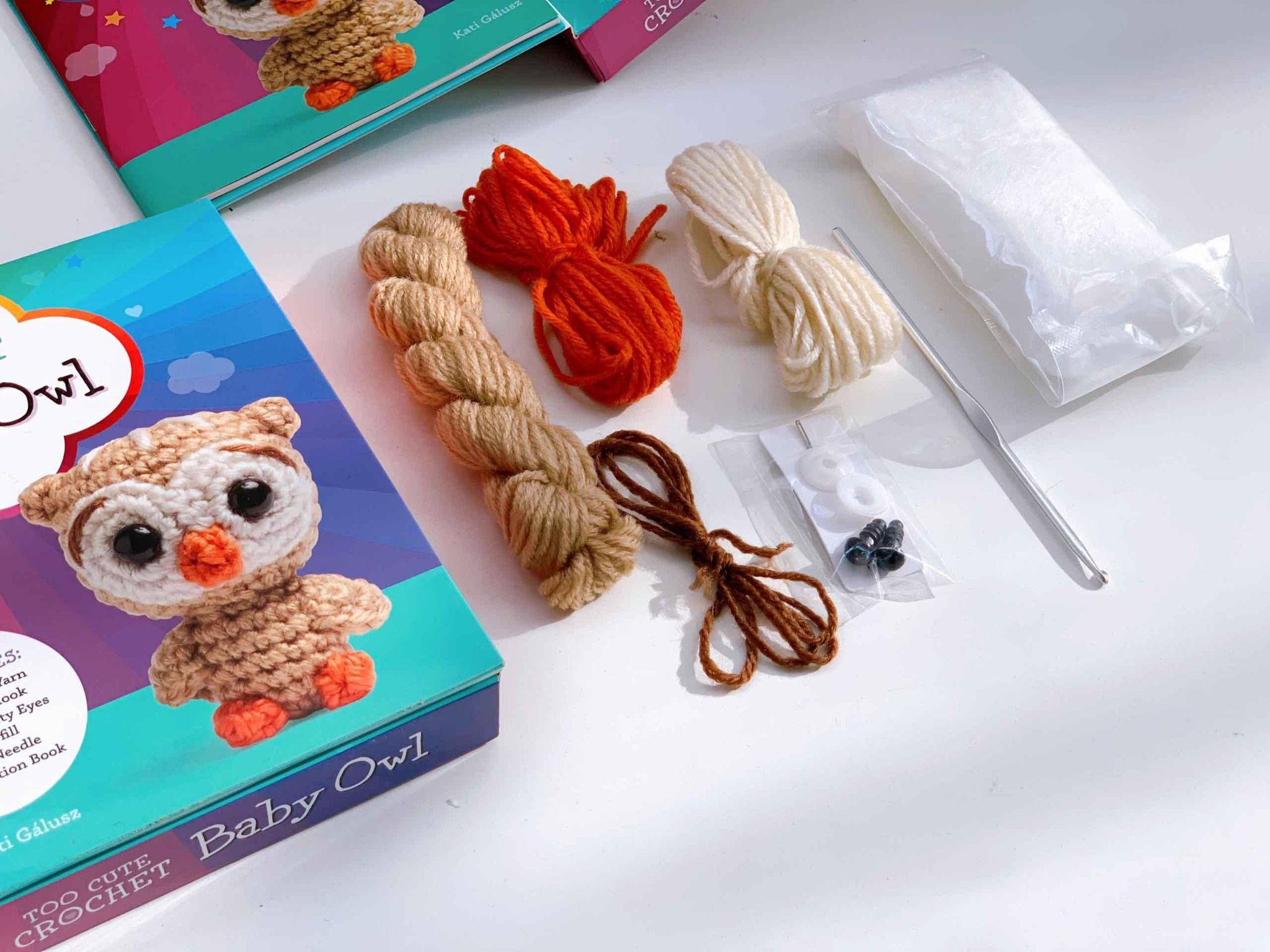 Đầy đủ nguyên vật liệu và hướng dẫn để trẻ đan móc bạn cú con đáng yêu.